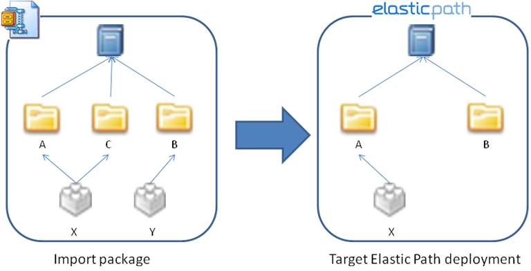 If the Update import strategy is selected, categories A and B are imported into Elastic Path. The imported versions replace the existing categories A and B. Category C and product Y are not imported.