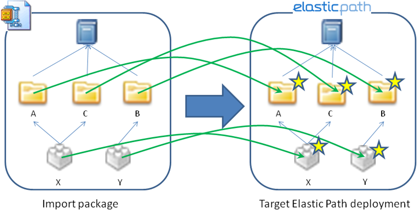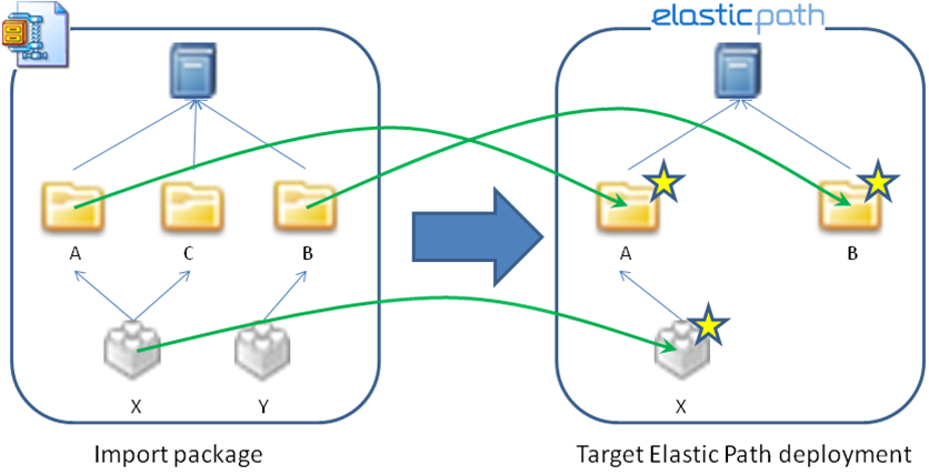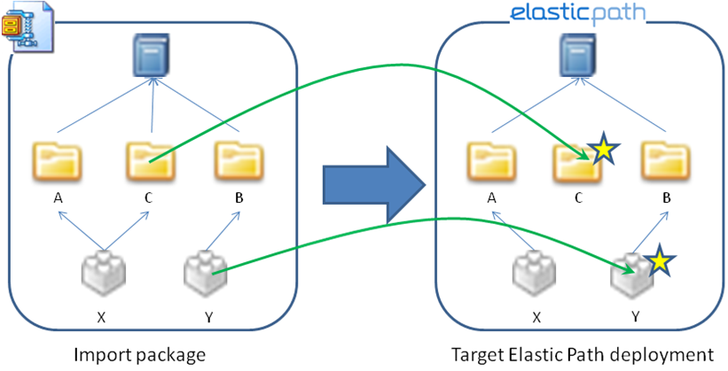 If the Insert import strategy is selected, category C and product Y are imported into Elastic Path. Category A, Category B, and Product X remain unchanged. (The stars indicate objects that have been updated after the import.)