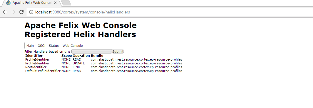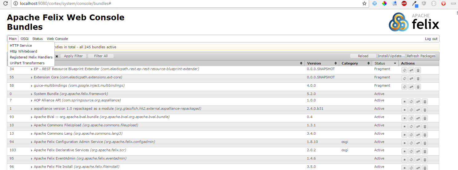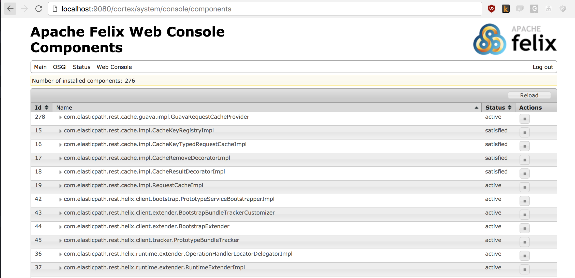 The Felix Web Console Bundles page can be used to address whether or not you’ve registered your bundles correctly with the Cortex Runtime. You can find the Bundles page at http:[server]:[port]/cortex/system/console/bundles. If Cortex is running locally at port 8080, the URL is http://localhost:8080/cortex/system/console/bundles.