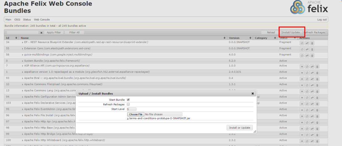To deploy a new bundle, on the Apache Felix Console’s Bundles page: