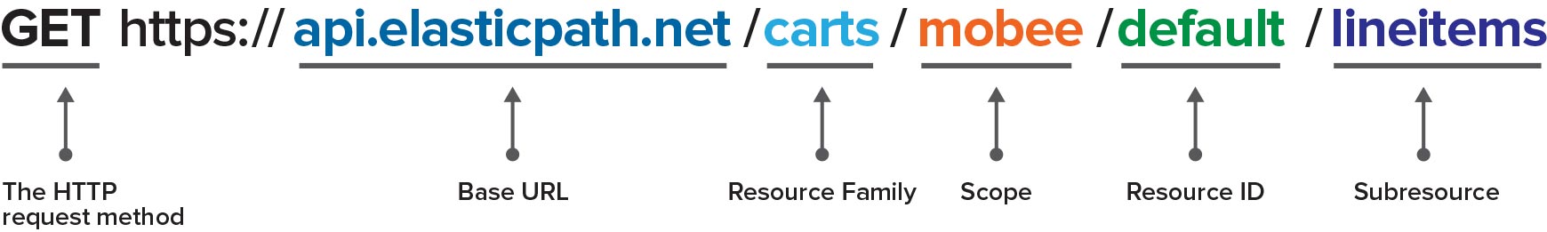 The image below shows a breakdown of a standard Cortex URL. The example request retrieves a list of line items in a shopper’s cart