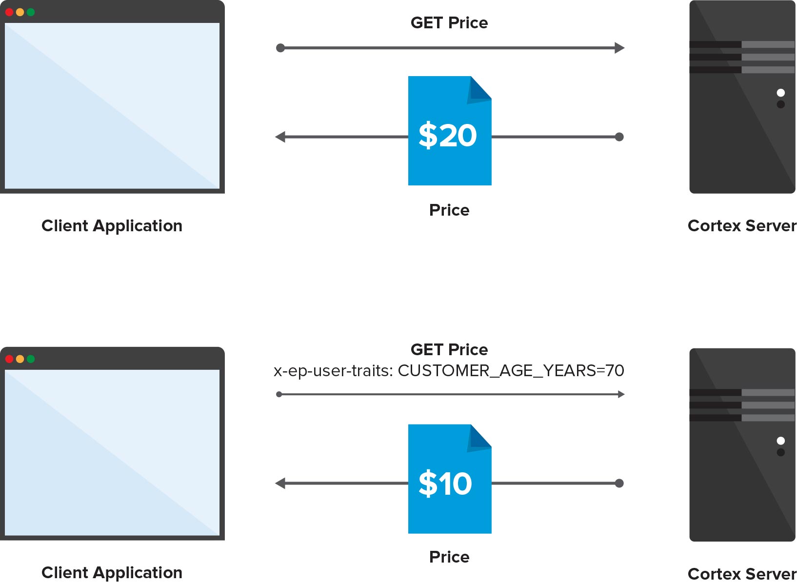Cortex supports personalization of prices and promotions. A shopper’s traits are added to a Cortex request in two ways: