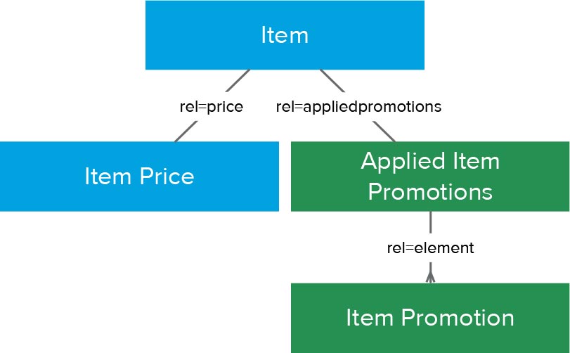 An item resource is a purchasable good or service. An item has a price and a list of applied promotions. The pricing and promotion resources are linked to an item as follows: