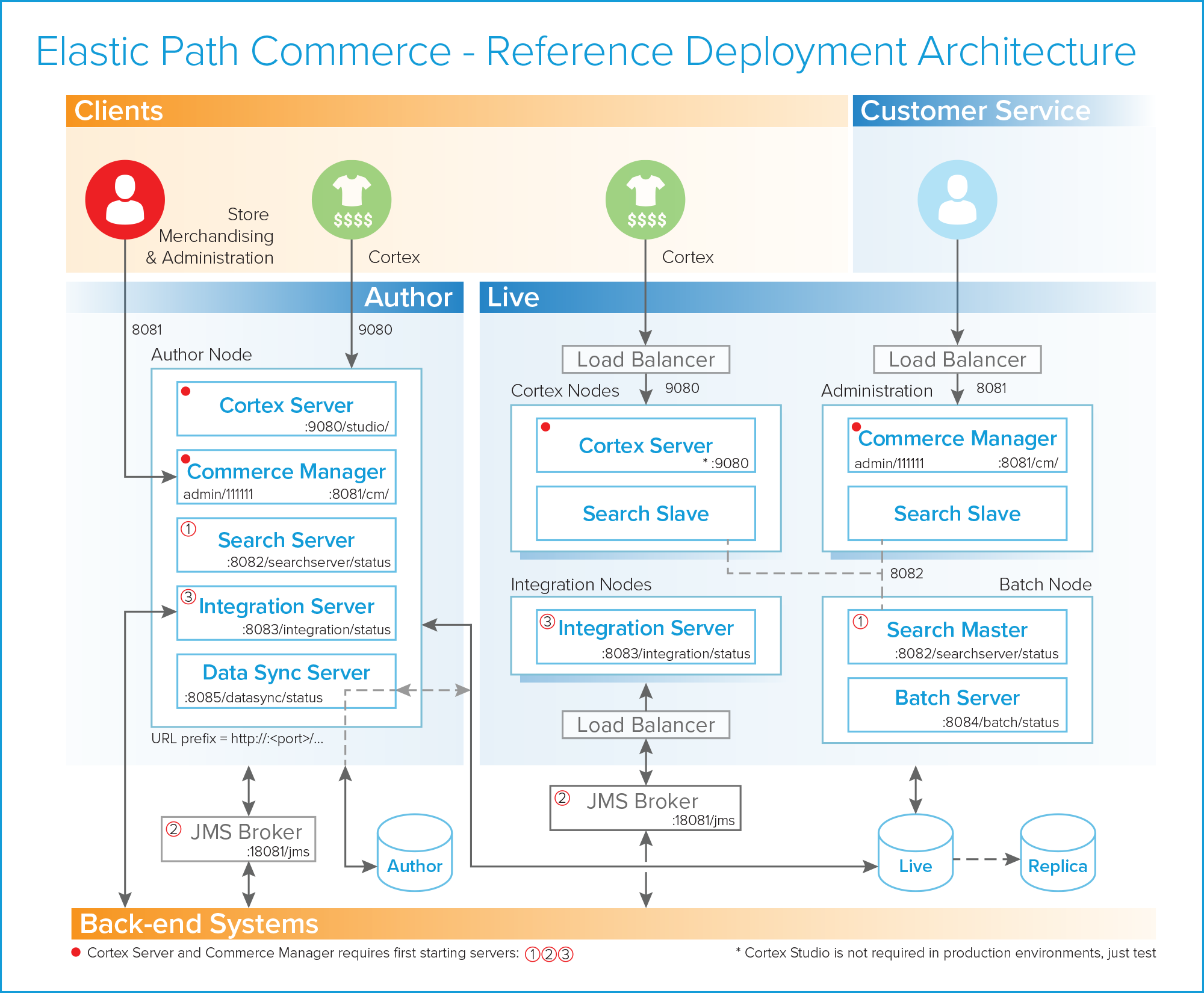 The following deployment diagram represents an example Self-Managed Commerce installation, showing all the components that are supplied and used. Your actual deployment architecture will depend on your organization’s specific requirements for performance, reliability, and scalability.